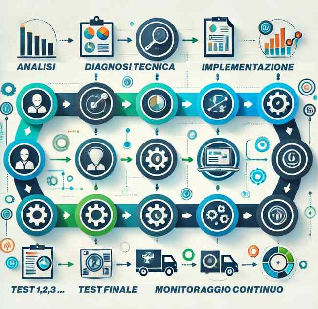 Affrontiamo ogni progetto con un approccio strutturato e orientato ai risultati. Attraverso fasi ben definite e l'utilizzo di strumenti avanzati, garantiamo un percorso chiaro per portare il tuo sistema, applicazione, ambiente di sviluppo o sito web dalla diagnosi iniziale alla soluzione ottimale. Di seguito le competenze che mettiamo in campo in ogni step del processo: